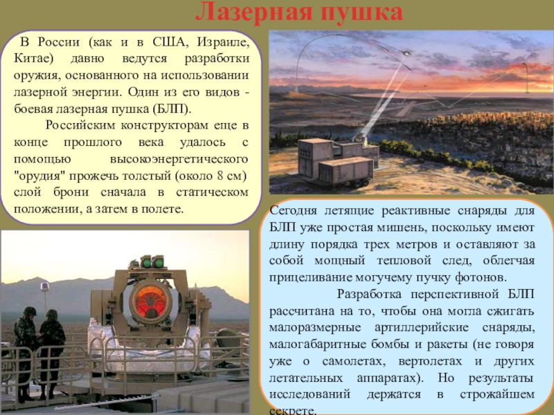 Разработка перспективной БЛП рассчитана на то, чтобы она могла сжигать малоразмерные артиллерийские снаряды, малогабаритные бомбы и ракеты (не говоря уже о самолетах, вертолетах и других летательных аппаратах). Но результаты исследований держатся в строжайшем секрете.