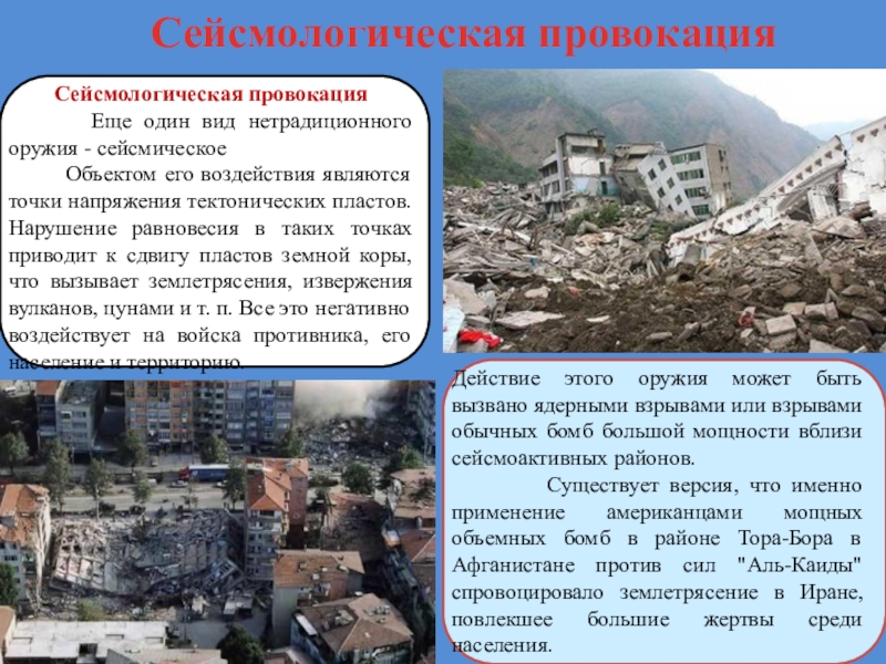 Действие этого оружия может быть вызвано ядерными взрывами или взрывами обычных бомб большой мощности вблизи сейсмоактивных районов.