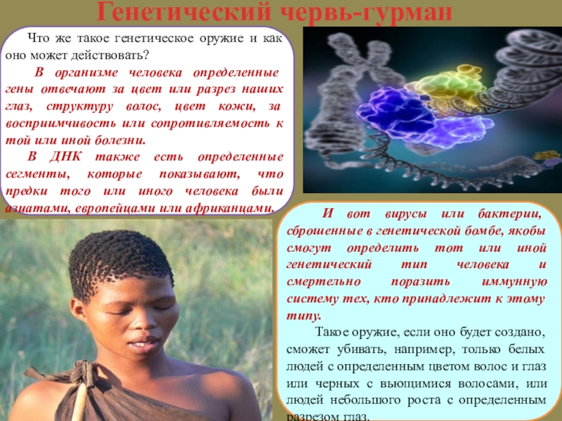 И вот вирусы или бактерии, сброшенные в генетической бомбе, якобы смогут определить тот или иной генетический тип человека и смертельно поразить иммунную систему тех, кто принадлежит к этому типу.