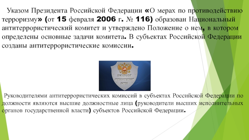 Руководителями антитеррористических комиссий в субъектах Российской Федерации по должности являются высшие должностные лица (руководители высших исполнительных органов государственной власти) субъектов Российской Федерации.