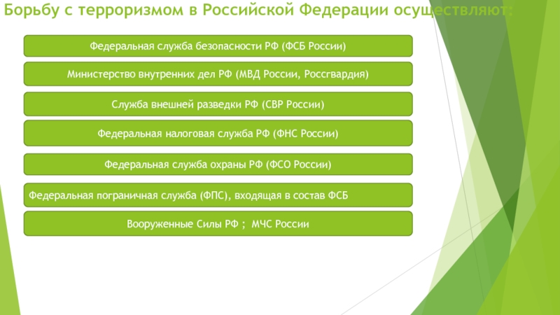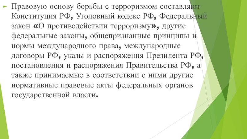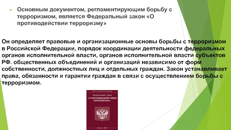 Он определяет правовые и организационные основы борьбы с терроризмом в Российской Федерации, порядок координации деятельности федеральных органов исполнительной власти, органов исполнительной власти субъектов РФ. общественных объединений и организаций независимо от форм собственности, должностных лиц и отдельных граждан. Закон устанавливает права, обязанности и гарантии граждан в связи с осуществлением борьбы с терроризмом.