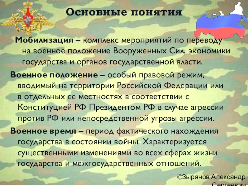 Военное положение – особый правовой режим, вводимый на территории Российской Федерации или в отдельных ее местностях в соответствии с Конституцией РФ Президентом РФ в случае агрессии против РФ или непосредственной угрозы агрессии.