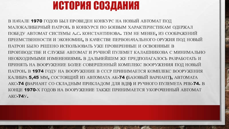 под малокалиберный патрон. В конкурсе по боевым характеристикам одержал победу автомат системы А.С. Константинова. Тем не менее, из соображений преемственности и экономии, в качестве первоначального оружия под новый патрон было решено использовать уже проверенные и освоенные в производстве и службе автомат и ручной пулемет Калашникова с минимально необходимыми изменениями. В дальнейшем же предполагалось разработать и принять на вооружение более совершенный комплекс вооружения под новый патрон. В 1974 году на вооружение В СССР принимается комплекс вооружения калибра 5,45 мм, состоящий из автомата АК-74 (базовый вариант), автомата АКС-74 (вариант со складным прикладом для ВДВ) и ручного пулемета РПК-74. В конце 1970-х годов на вооружение также принимается укороченный автомат АКС-74У.