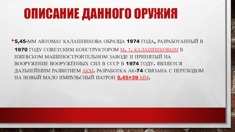 Описание данного оружия5,45-мм автомат Калашникова образца 1974 года, разработанный в 1970 году советским конструктором М. Т. Калашниковым в ижевском машиностроительном заводе и