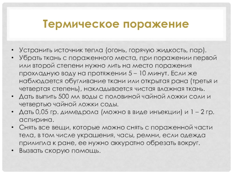Термическое поражениеУстранить источник тепла (огонь, горячую жидкость, пар). Убрать ткань с пораженного места, при поражении первой или