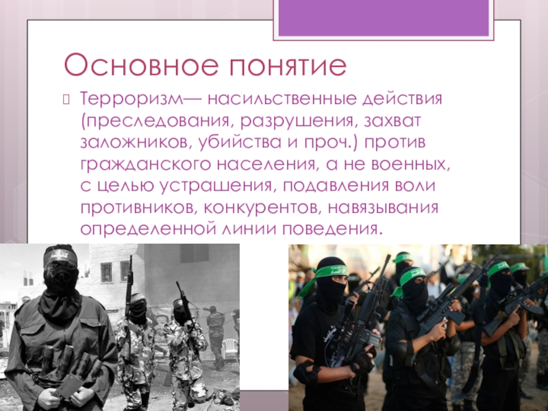 Основное понятиеТерроризм— насильственные действия (преследования, разрушения, захват заложников, убийства и проч.) против гражданского населения, а не военных,