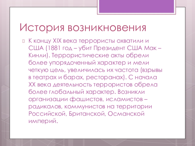 История возникновения К концу XIX века террористы охватили и США (1881 год – убит Президент США Мак