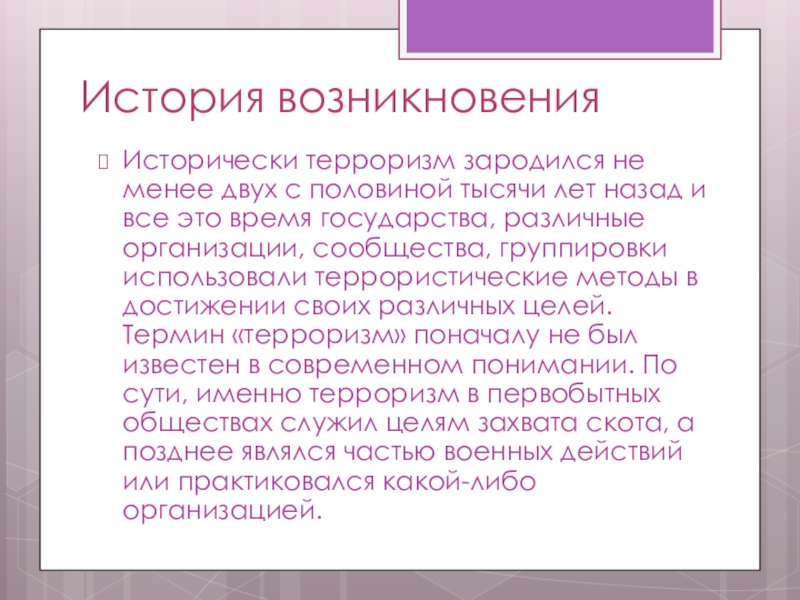 лет назад и все это время государства, различные организации, сообщества, группировки использовали террористические методы в достижении своих различных целей. Термин «терроризм» поначалу не был известен в современном понимании. По сути, именно терроризм в первобытных обществах служил целям захвата скота, а позднее являлся частью военных действий или практиковался какой-либо организацией.