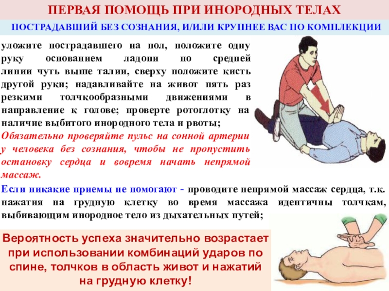 Вероятность успеха значительно возрастает при использовании комбинаций ударов по спине, толчков в область живот и нажатий на грудную клетку!