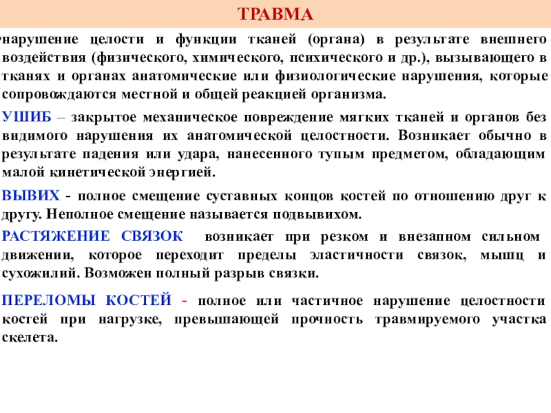 УШИБ – закрытое механическое повреждение мягких тканей и органов без видимого нарушения их анатомической целостности. Возникает обычно в результате падения или удара, нанесенного тупым предметом, обладающим малой кинетической энергией.