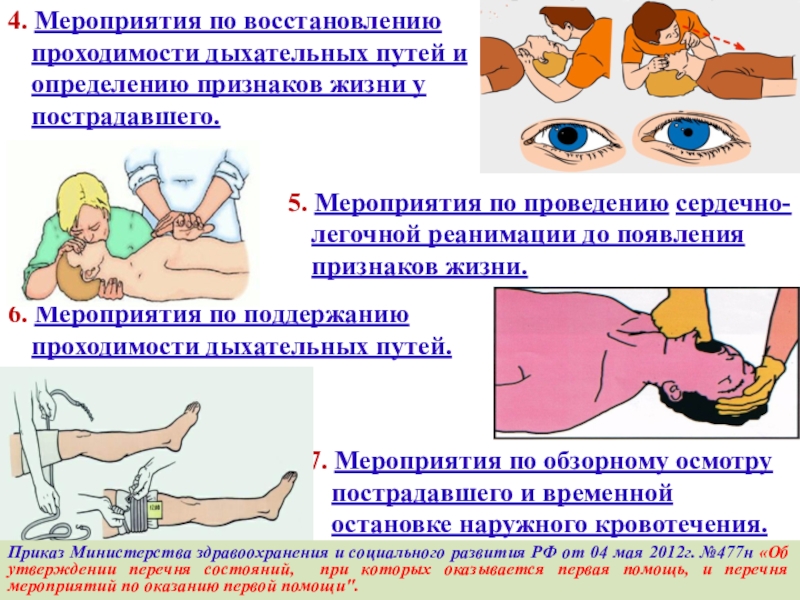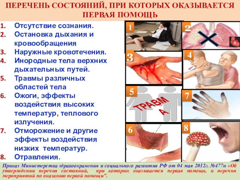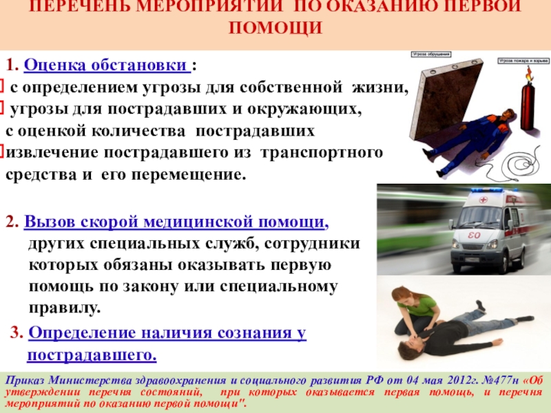 Приказ Министерства здравоохранения и социального развития РФ от 04 мая 2012г. №477н «Об утверждении перечня состояний, при которых оказывается первая помощь, и перечня мероприятий по оказанию первой помощи".