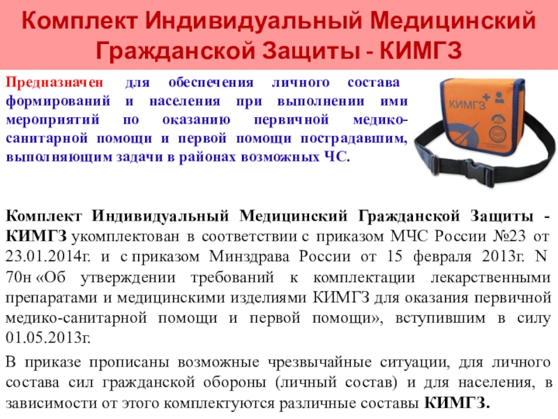 Предназначен для обеспечения личного состава формирований и населения при выполнении ими мероприятий по оказанию первичной медико-санитарной помощи и первой помощи пострадавшим, выполняющим задачи в районах возможных ЧС.