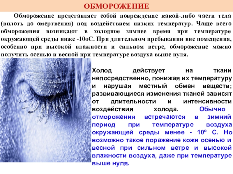 Холод действует на ткани непосредственно, понижая их температуру и нарушая местный обмен веществ; развивающиеся изменения тканей зависят от длительности и интенсивности воздействия холода. Обычно отморожения встречаются в зимний период при температуре воздуха окружающей среды менее - 10º С. Но возможно такое поражение кожи осенью и весной при сильном ветре и высокой влажности воздуха, даже при температуре выше нуля.