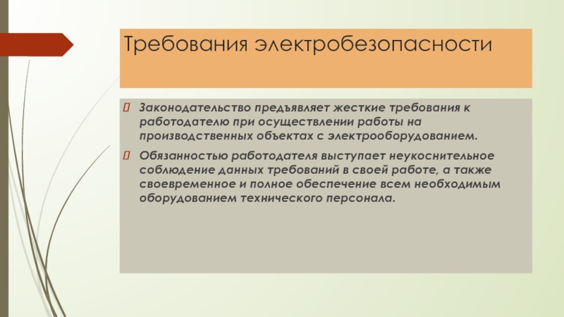 Требования электробезопасностиЗаконодательство предъявляет жесткие требования к работодателю при осуществлении работы на производственных объектах с электрооборудованием.Обязанностью работодателя выступает