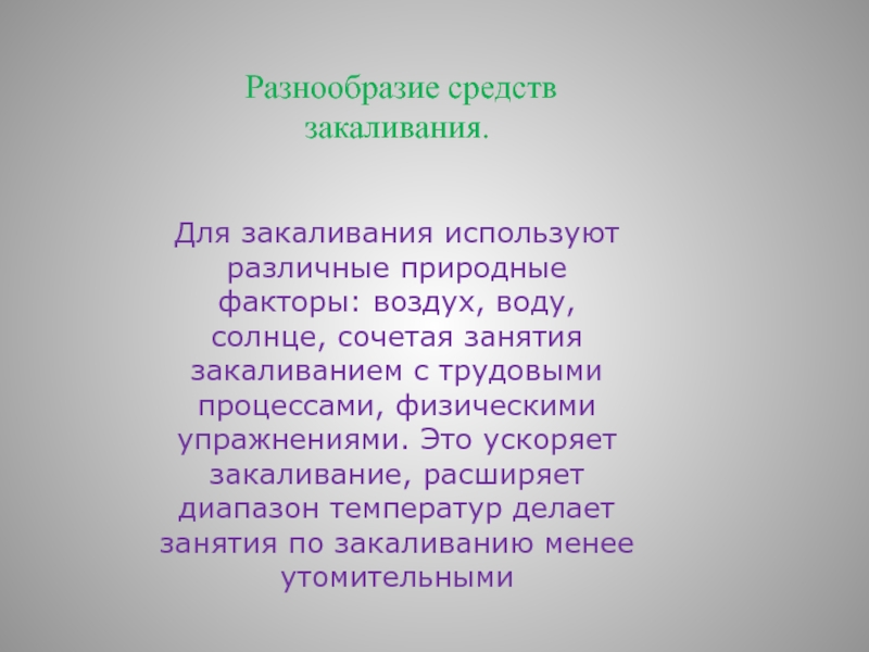 ЗАКАЛИВАНИЕ ОРГАНИЗМА Закаливание — это система использования физических факторов внешней среды для повышения сопротивляемости организма к простудным