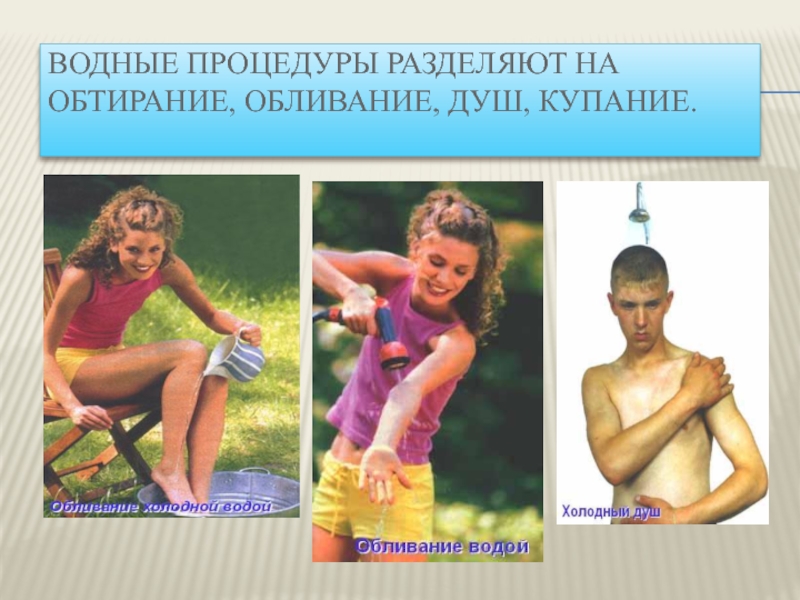 Водные процедуры разделяют на обтирание, обливание, душ, купание.
