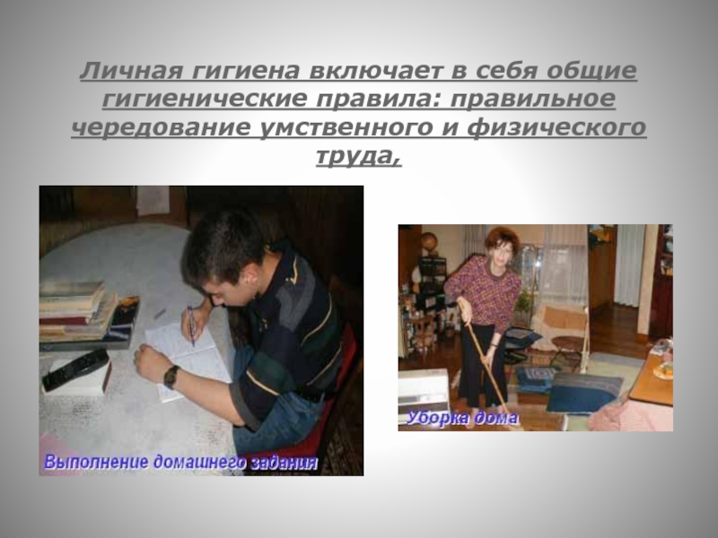 Личная гигиена включает в себя общие гигиенические правила: правильное чередование умственного и физического труда,