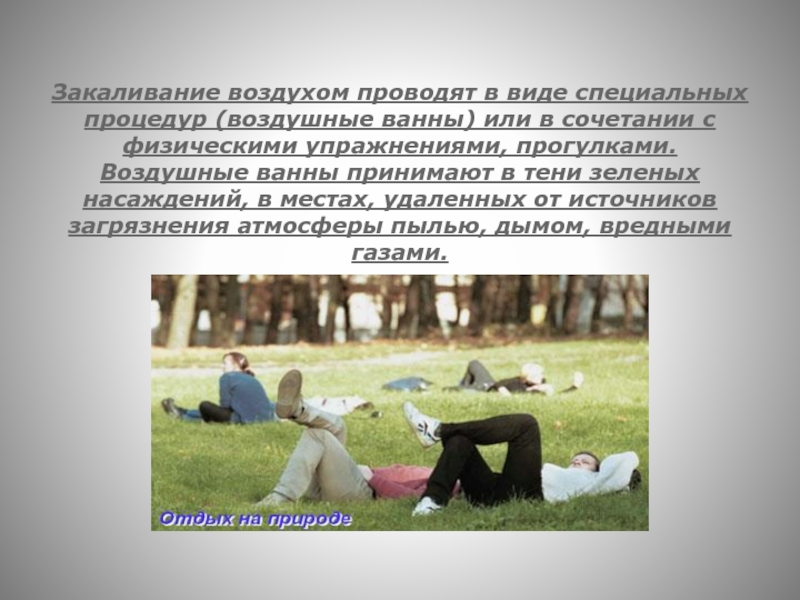 Слайд 11Закаливание воздухом проводят в виде специальных процедур (воздушные ванны) или в