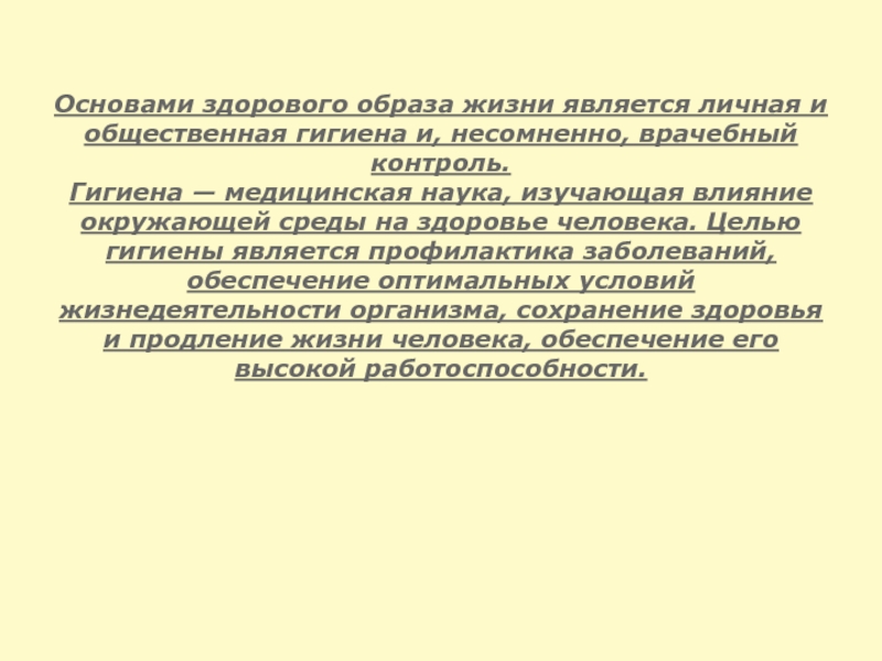 Основами здорового образа жизни является личная и общественная гигиена и, несомненно, врачебный контроль. Гигиена — медицинская наука,