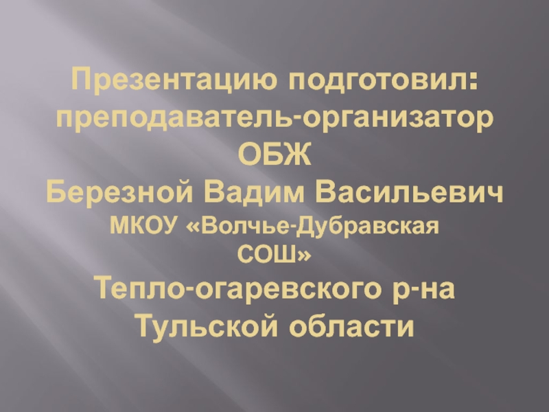 Слайд 2Презентацию подготовил: преподаватель-организатор ОБЖ Березной Вадим Васильевич МКОУ «Волчье-Дубравская СОШ» Тепло-огаревского р-на Тульской области