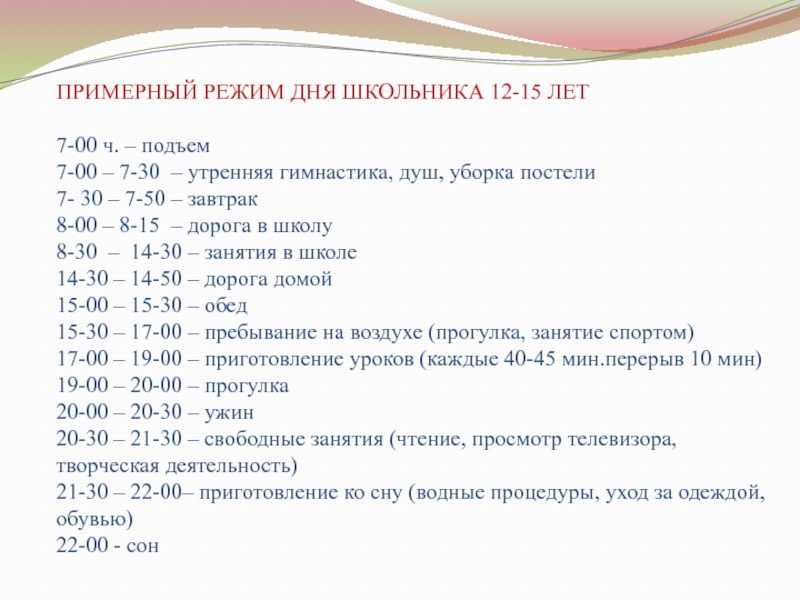 ПРИМЕРНЫЙ РЕЖИМ ДНЯ ШКОЛЬНИКА 12-15 ЛЕТ 7-00 ч. – подъем 7-00 – 7-30 – утренняя гимнастика, душ, уборка постели 7- 30 – 7-50 – завтрак 8-00 – 8-15 – дорога в школу 8-30 – 14-30 – занятия в школе 14-30 – 14-50 – дорога домой 15-00 – 15-30 – обед 15-30 – 17-00 – пребывание на воздухе (прогулка, занятие спортом) 17-00 – 19-00 – приготовление уроков (каждые 40-45 мин.перерыв 10 мин) 19-00 – 20-00 – прогулка 20-00 – 20-30 – ужин 20-30 – 21-30 – свободные занятия (чтение, просмотр телевизора, творческая деятельность) 21-30 – 22-00– приготовление ко сну (водные процедуры, уход за одеждой, обувью) 22-00 - сон
