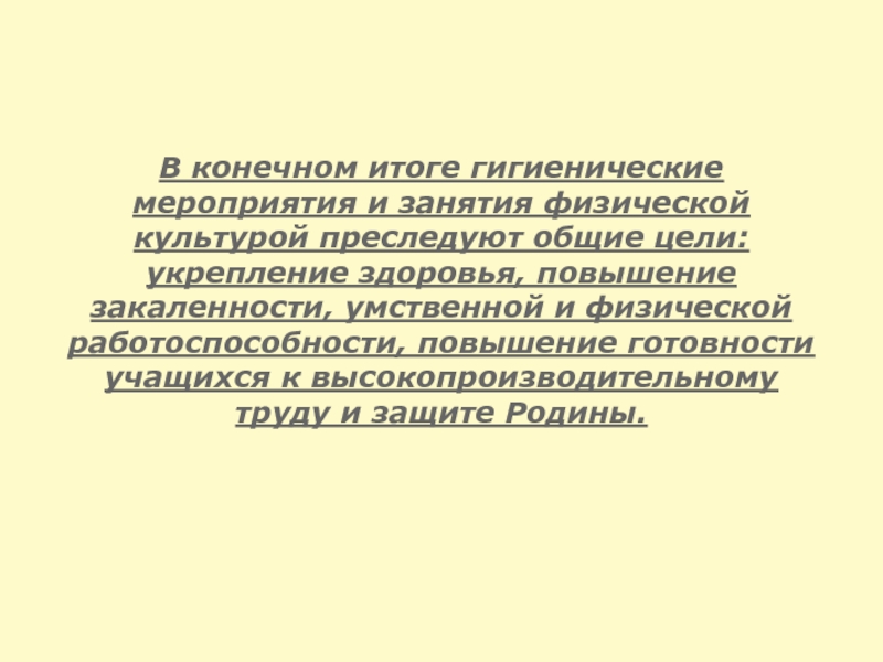 В конечном итоге гигиенические мероприятия и занятия физической культурой преследуют общие цели: укрепление здоровья, повышение закаленности, умственной