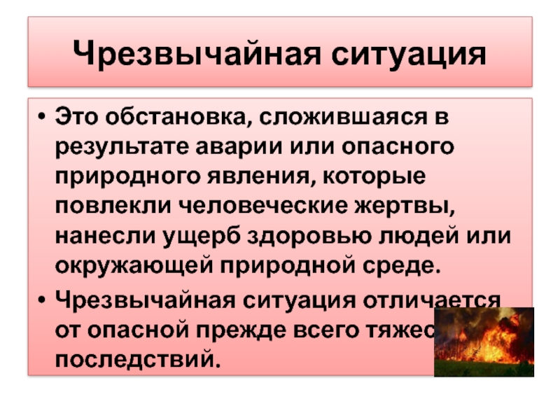 Чрезвычайная ситуацияЭто обстановка, сложившаяся в результате аварии или опасного природного явления, которые повлекли человеческие жертвы, нанесли ущерб
