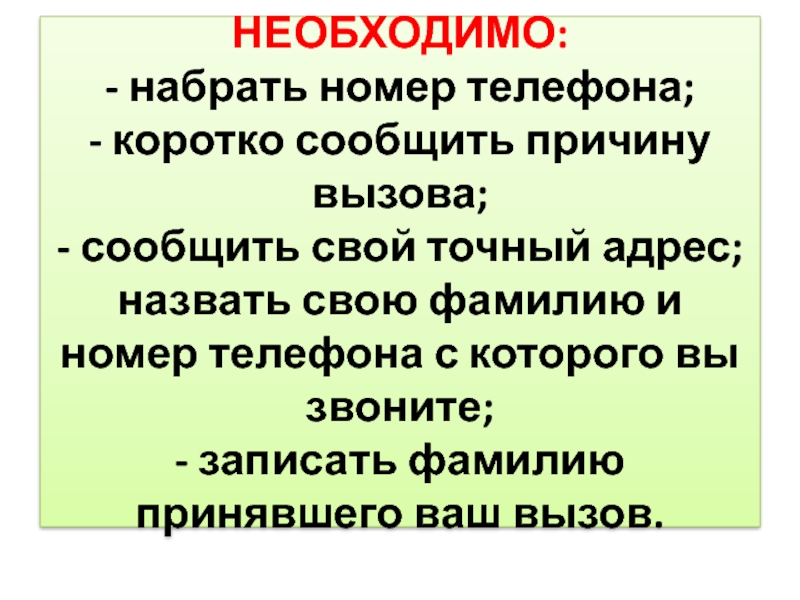 НЕОБХОДИМО: - набрать номер телефона; - коротко сообщить причину вызова; - сообщить свой точный адрес; назвать