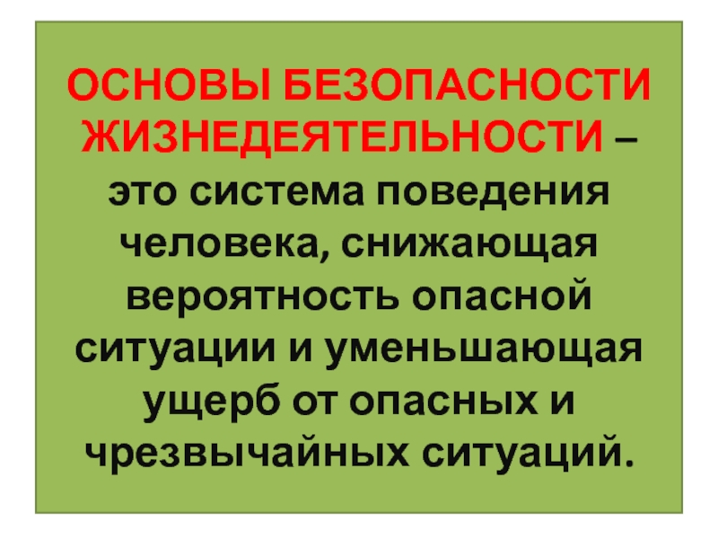 ОСНОВЫ БЕЗОПАСНОСТИ ЖИЗНЕДЕЯТЕЛЬНОСТИ – это система поведения человека, снижающая вероятность опасной ситуации и уменьшающая ущерб от опасных