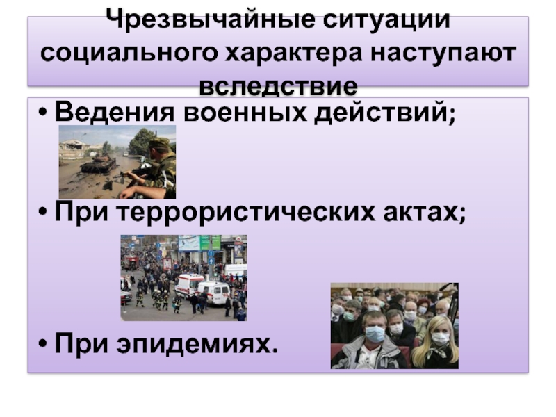 Чрезвычайные ситуации социального характера наступают вследствиеВедения военных действий;При террористических актах;При эпидемиях.