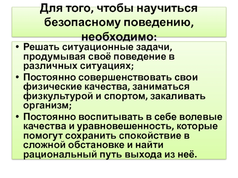 Для того, чтобы научиться безопасному поведению, необходимо:Решать ситуационные задачи, продумывая своё поведение в различных ситуациях;Постоянно совершенствовать свои