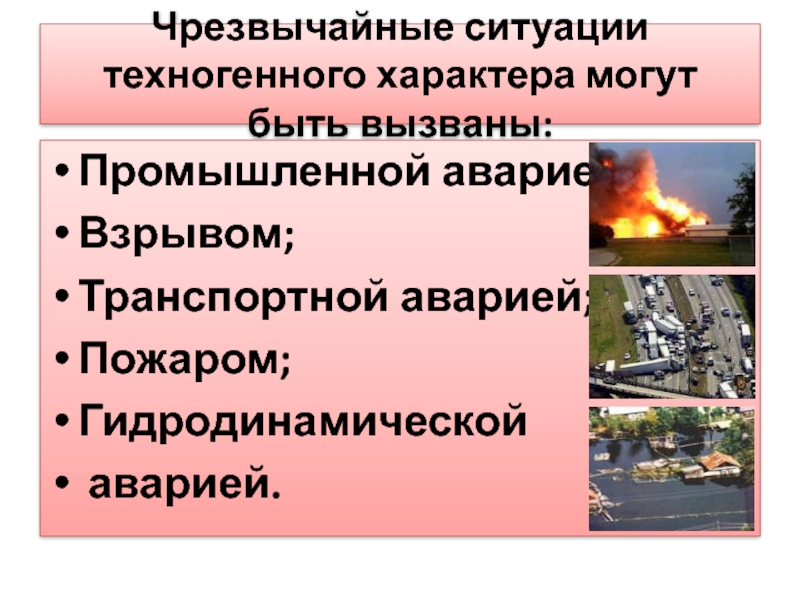 Чрезвычайные ситуации техногенного характера могут быть вызваны:Промышленной аварией;Взрывом;Транспортной аварией;Пожаром;Гидродинамической аварией.