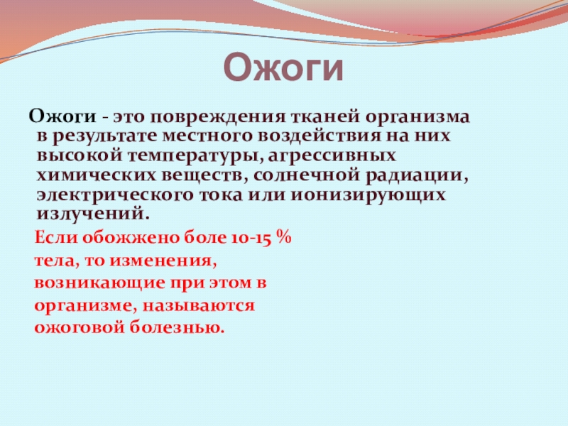 Если обожжено боле 10-15 % тела, то изменения, возникающие при этом в организме, называются ожоговой болезнью.