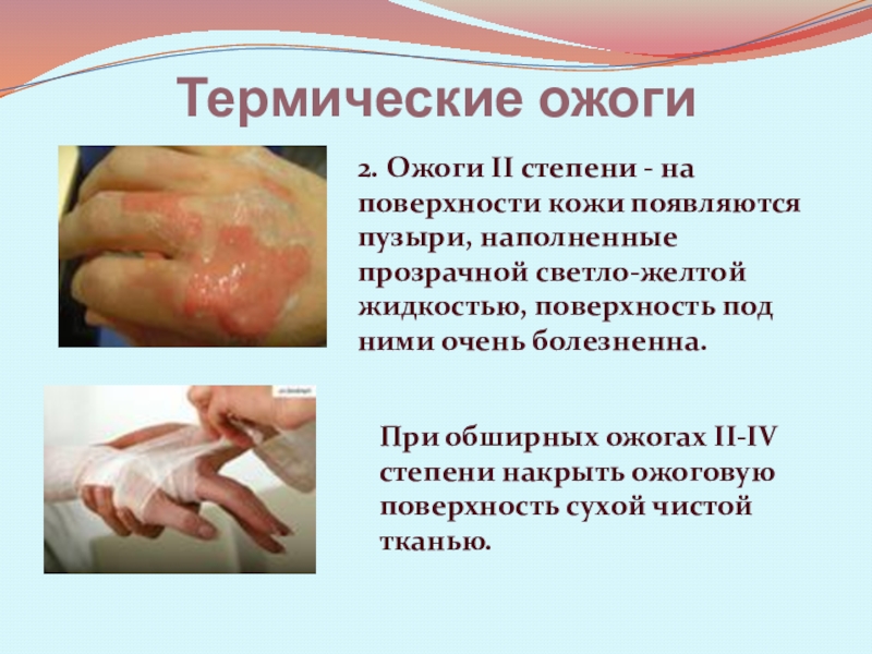При обширных ожогах II-IV степени накрыть ожоговую поверхность сухой чистой тканью.