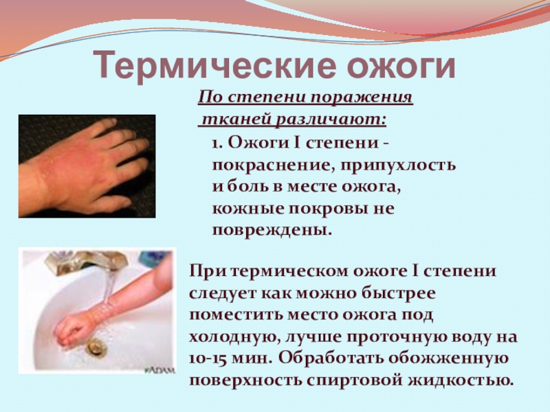 При термическом ожоге I степени следует как можно быстрее поместить место ожога под холодную, лучше проточную воду на 10-15 мин. Обработать обожженную поверхность спиртовой жидкостью.