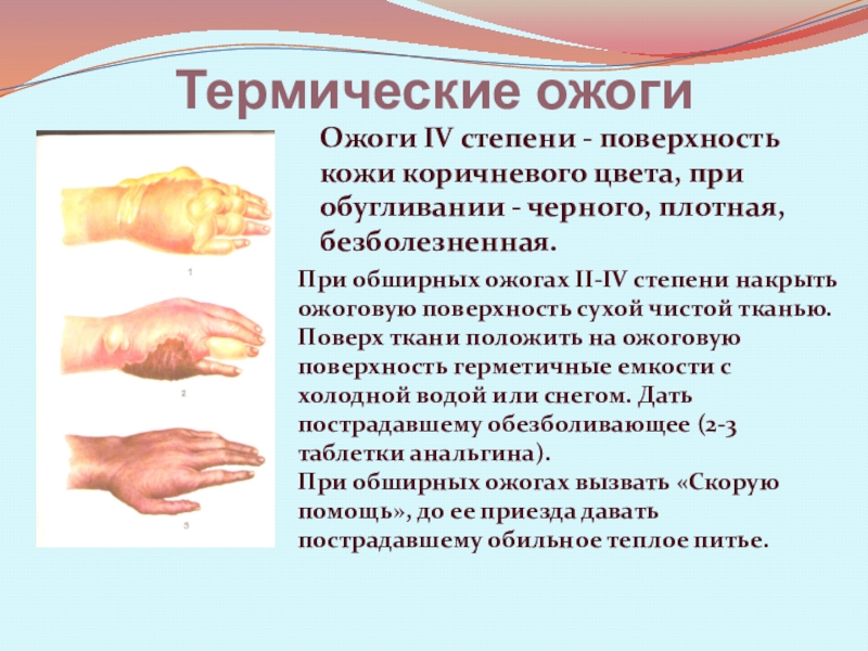 При обширных ожогах вызвать «Скорую помощь», до ее приезда давать пострадавшему обильное теплое питье.