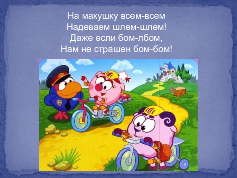 На макушку всем-всем Надеваем шлем-шлем! Даже если бом-лбом, Нам не страшен бом-бом!