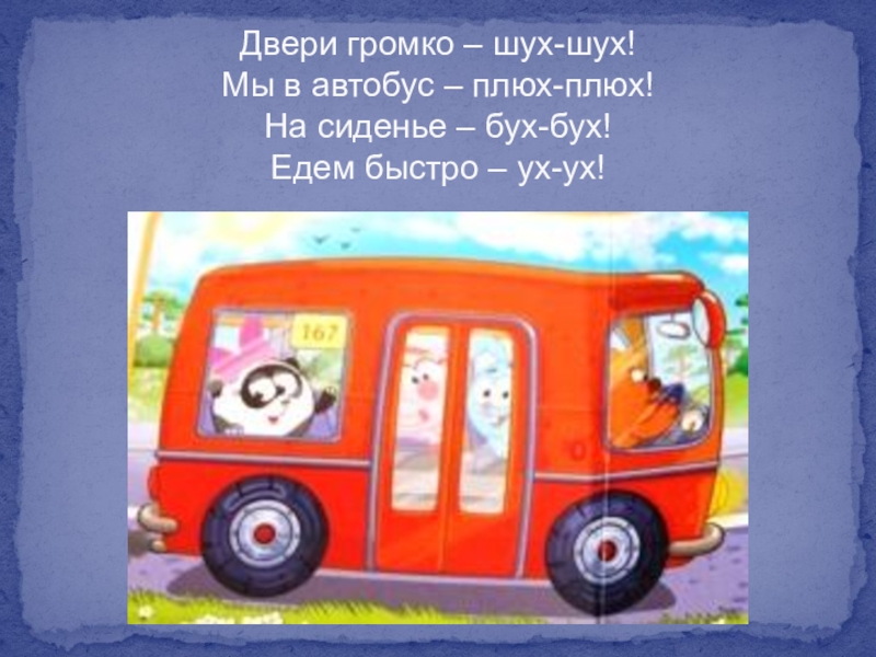 Двери громко – шух-шух! Мы в автобус – плюх-плюх! На сиденье – бух-бух! Едем быстро – ух-ух!