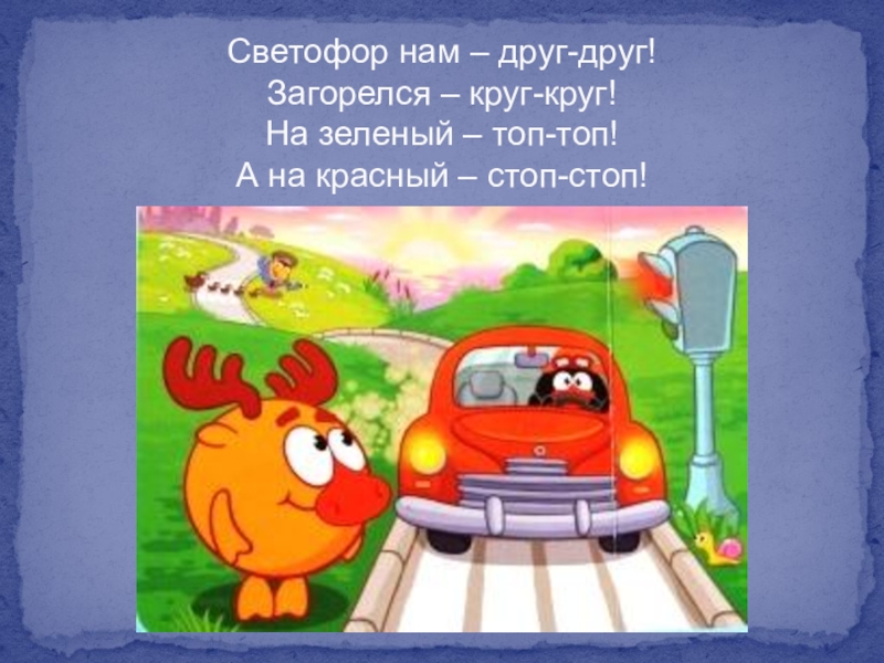 Слайд 3Светофор нам – друг-друг! Загорелся – круг-круг! На зеленый – топ-топ! А на красный
