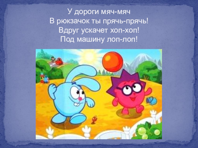 У дороги мяч-мяч В рюкзачок ты прячь-прячь! Вдруг ускачет хоп-хоп! Под машину лоп-лоп!