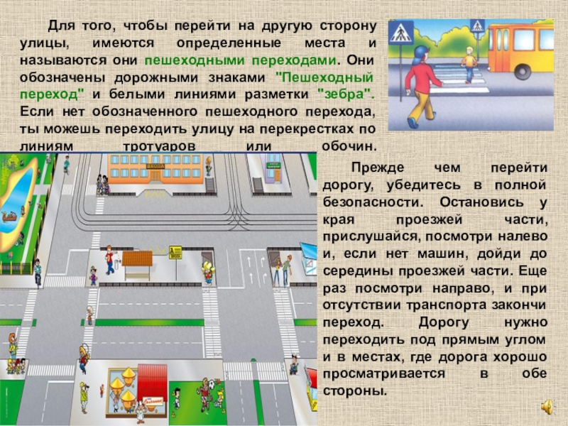 Слайд 10 Для того, чтобы перейти на другую сторону улицы, имеются определенные места