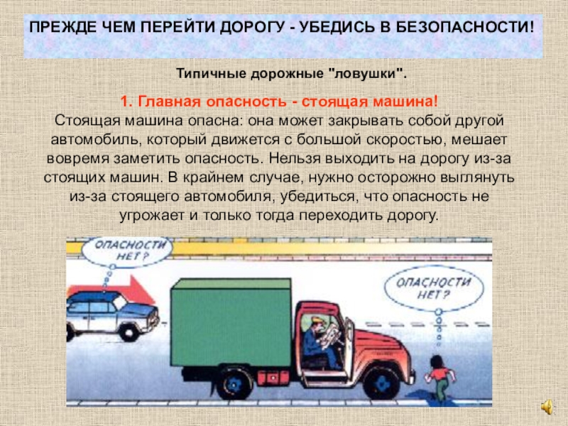 Стоящая машина опасна: она может закрывать собой другой автомобиль, который движется с большой скоростью, мешает вовремя заметить опасность. Нельзя выходить на дорогу из-за стоящих машин. В крайнем случае, нужно осторожно выглянуть из-за стоящего автомобиля, убедиться, что опасность не угрожает и только тогда переходить дорогу.