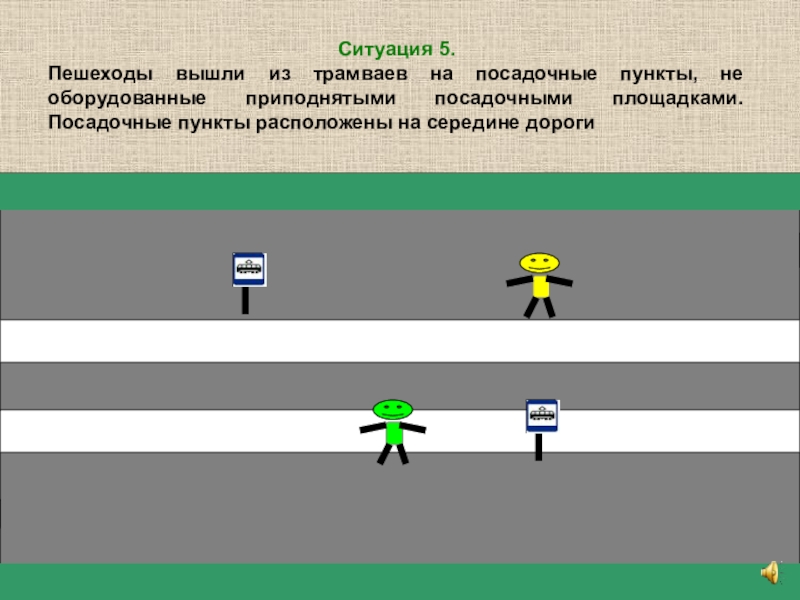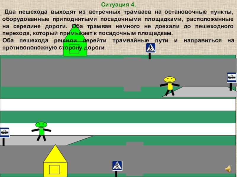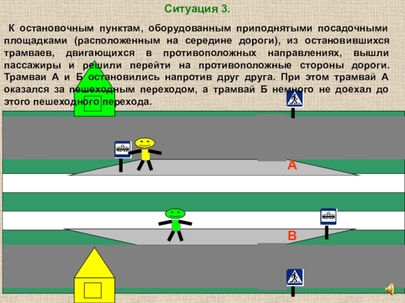середине дороги), из остановившихся трамваев, двигающихся в противоположных направлениях, вышли пассажиры и решили перейти на противоположные стороны дороги. Трамваи А и Б остановились напротив друг друга. При этом трамвай А оказался за пешеходным переходом, а трамвай Б немного не доехал до этого пешеходного перехода.