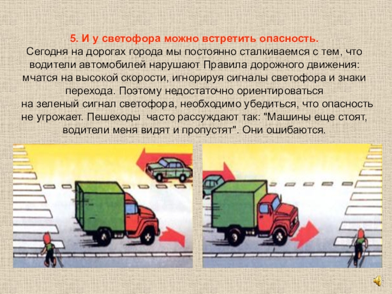 на зеленый сигнал светофора, необходимо убедиться, что опасность не угрожает. Пешеходы часто рассуждают так: "Машины еще стоят, водители меня видят и пропустят". Они ошибаются.