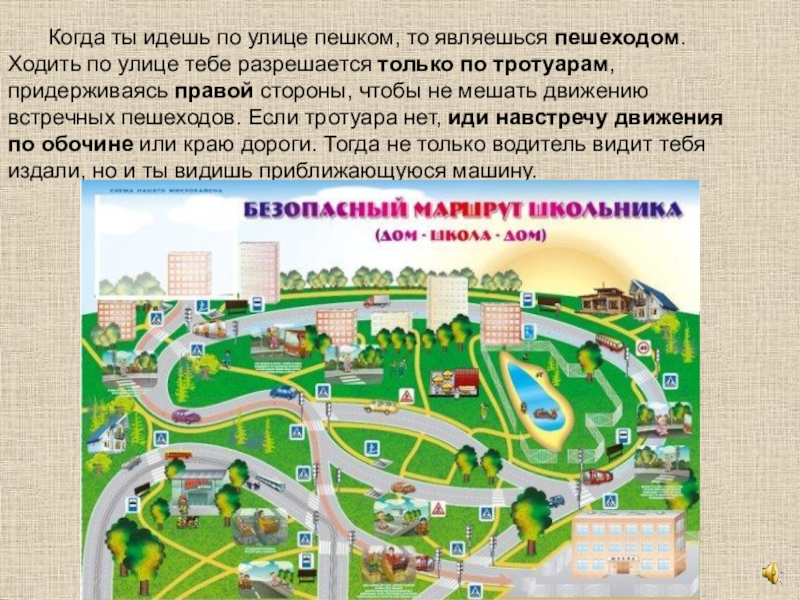 улице тебе разрешается только по тротуарам, придерживаясь правой стороны, чтобы не мешать движению встречных пешеходов. Если тротуара нет, иди навстречу движения по обочине или краю дороги. Тогда не только водитель видит тебя издали, но и ты видишь приближающуюся машину.