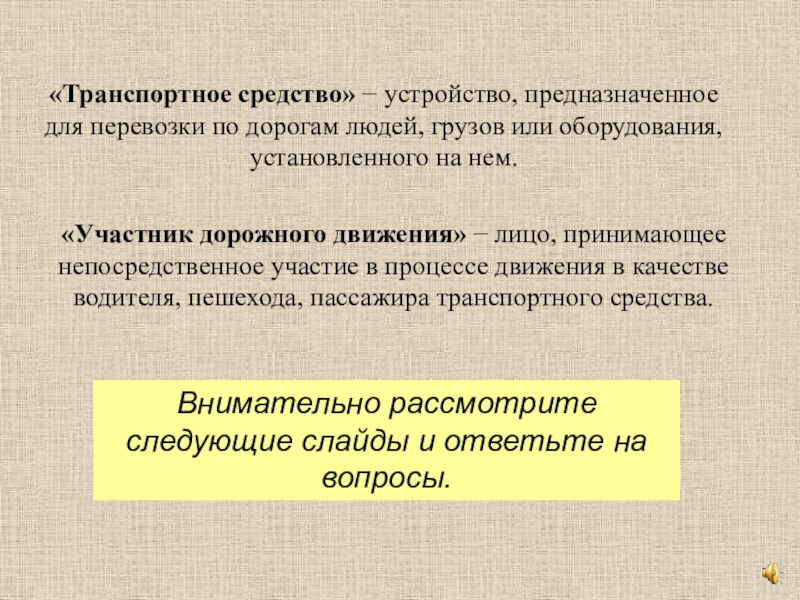 Слайд 14«Транспортное средство» устройство, предназначенное для перевозки по дорогам людей, грузов
