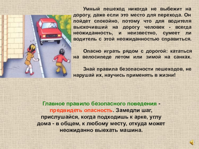 Главное правило безопасного поведения - предвидеть опасность. Замедли шаг, прислушайся, когда подходишь к арке, углу дома - в общем, к любому месту, откуда может неожиданно выехать машина.