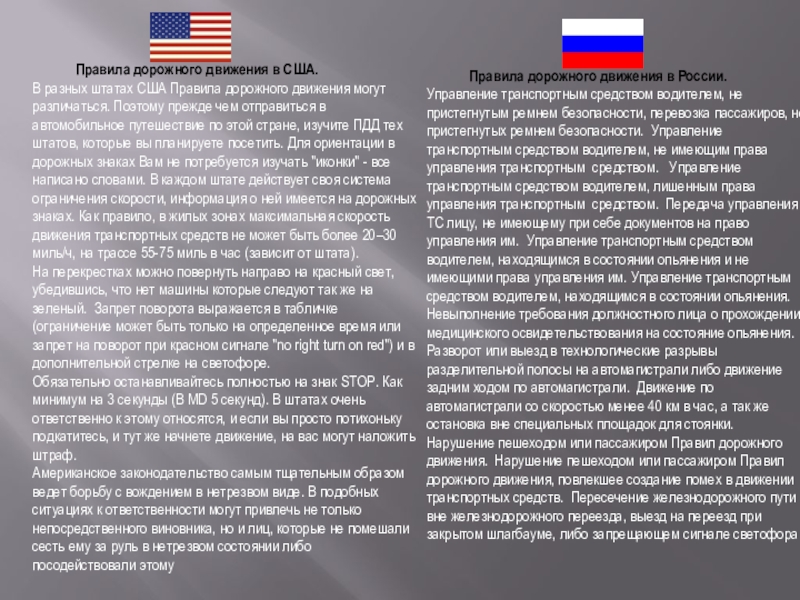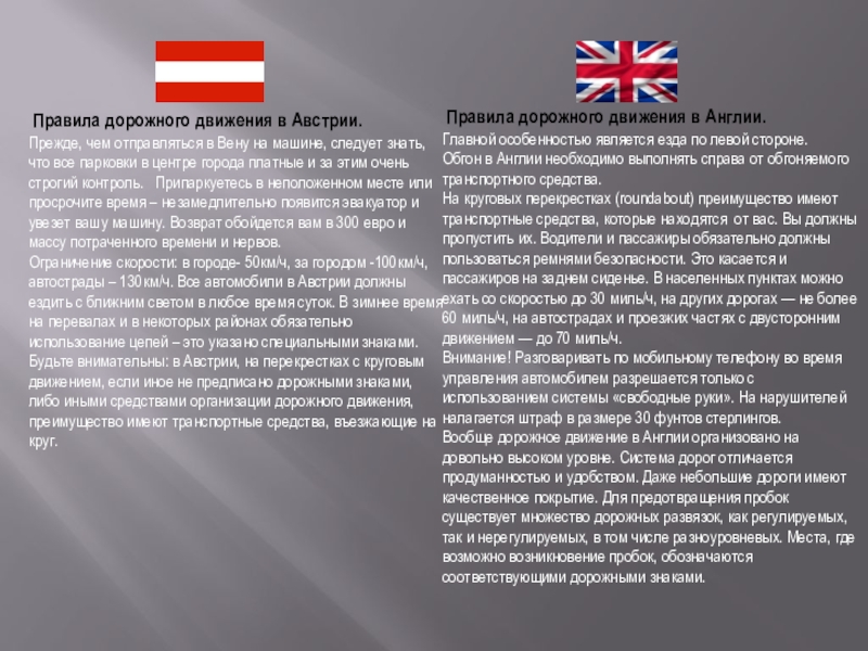 На круговых перекрестках (roundabout) преимущество имеют транспортные средства, которые находятся от вас. Вы должны пропустить их. Водители и пассажиры обязательно должны пользоваться ремнями безопасности. Это касается и пассажиров на заднем сиденье. В населенных пунктах можно ехать со скоростью до 30 миль/ч, на других дорогах — не более 60 миль/ч, на автострадах и проезжих частях с двусторонним движением — до 70 миль/ч.