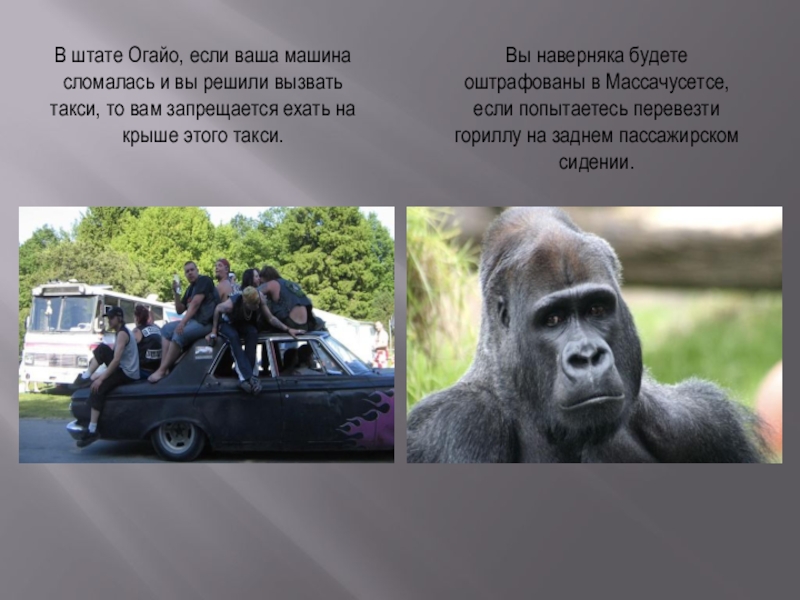 Вы наверняка будете оштрафованы в Массачусетсе, если попытаетесь перевезти гориллу на заднем пассажирском сидении.