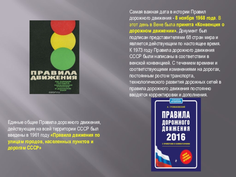 Самая важная дата в истории Правил дорожного движения - 8 ноября 1968 года. В этот день в Вене была принята «Конвенция о дорожном движении». Документ был подписан представителями 68 стран мира и является действующим по настоящее время.